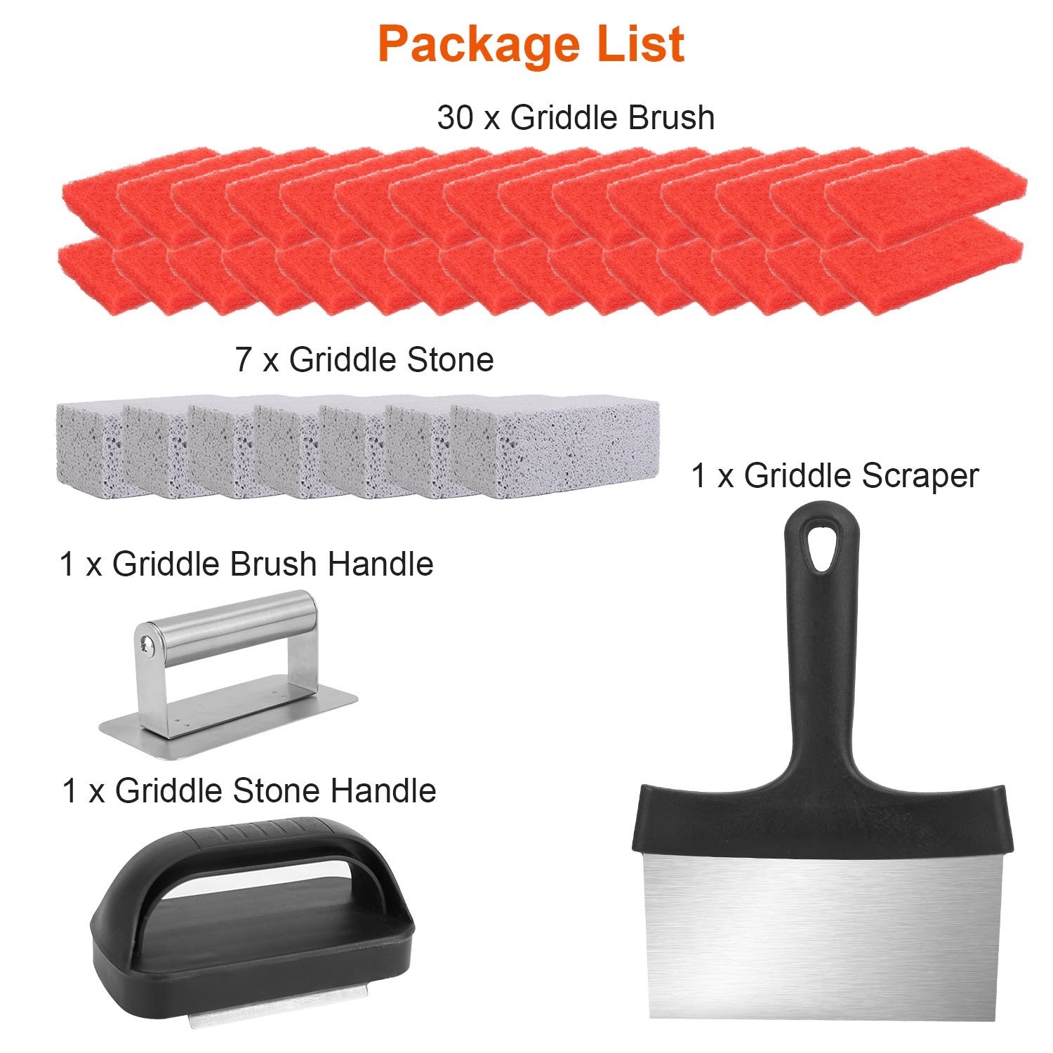 *40Pcs Professional Griddle Cleaning Kit*:Comes with 1Pc griddle scraper,30Pcs grill brushes and 1Pc handle,7Pcs griddle stone with 1Pc handle,allowing you to quickly clean grease,stains,food residue on the griddle top and make your griddle gleaming in a short time with less effort.