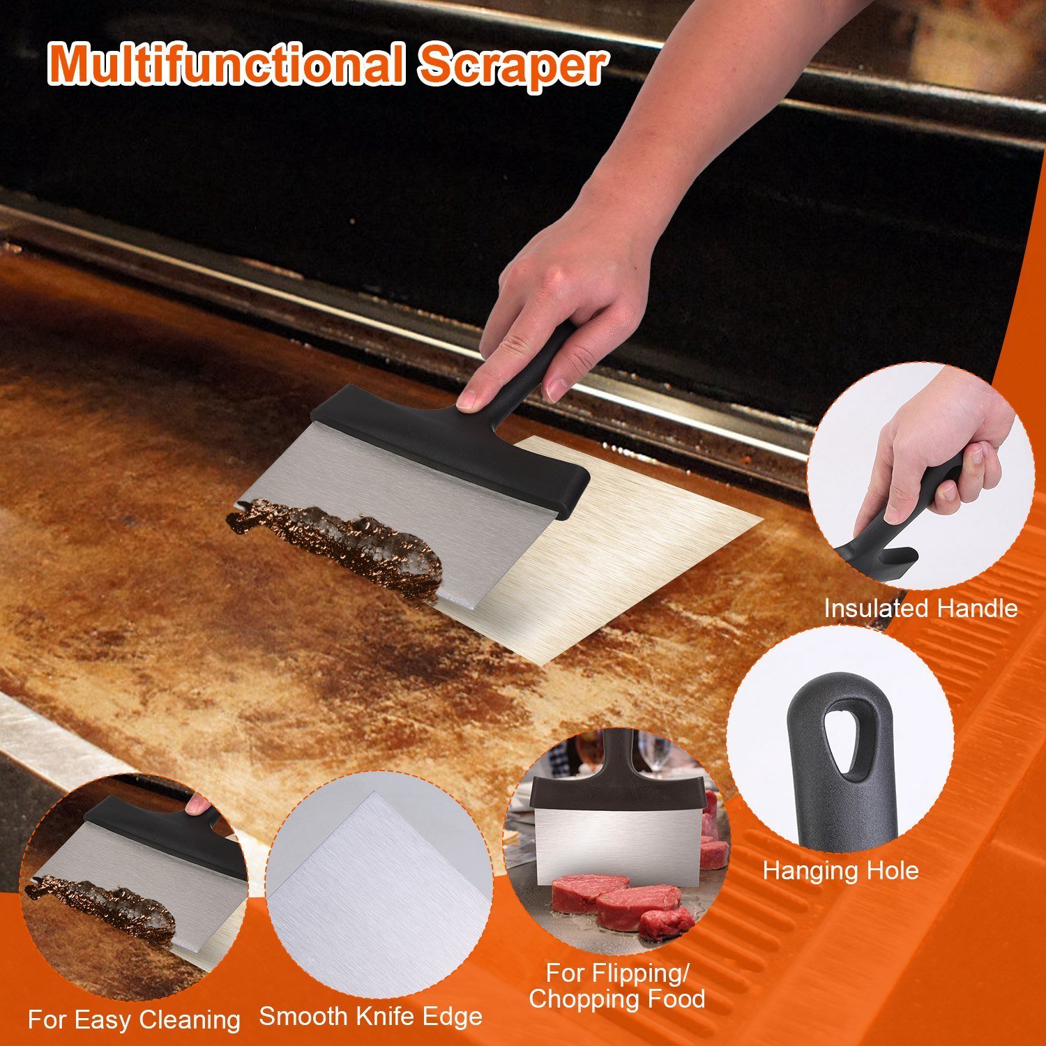 *Multipurpose Griddle Scraper*:The stainless steel griddle scraper is a multifunctional tool for your BBQ. Not only can be used to scrape the the bits off the skillet,but also can be used to flip or chop the food,like meat,pizza,bread,etc..