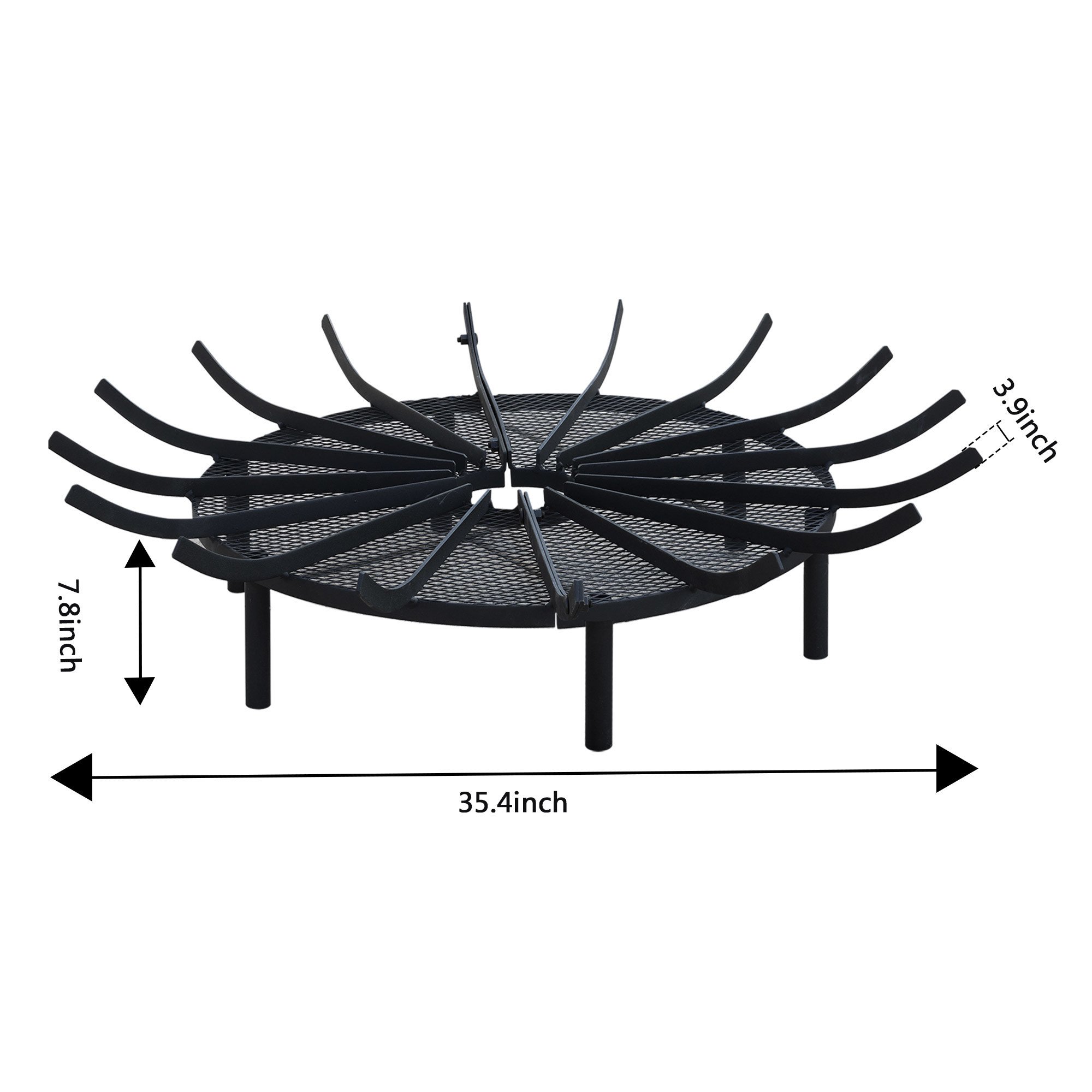 Dimension - Aoodor Firepit grate decorative measures 36 inch diameter x 7 inch high; 5 inch metal wire height from the ground. Raises the firewood from the chimney floor and hearth allowing for better air circulation. Makes it incredibly easy to start a fire and produces an ample amount of heat. Iron structure fireplace log holder rack will last a long time