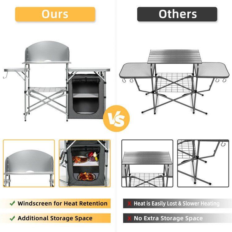 1.Folding Design with Multi-functionality: This camping table with a folding design provides you with portable to use and space-saving at home. And it's easy for you to open, set up, and close in less than a minute. In addition, there are two shelves of zippered bag that protects your food from bugs and animals. The removable steel windscreen protects your food from the weather.