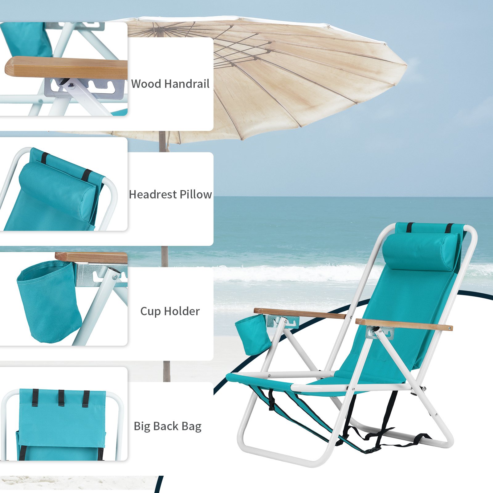 Introductions:Discover the ultimate in outdoor relaxation with our Folding Beach Chair, designed to enhance your beach days, camping trips, and backyard lounging. This portable chair combines the convenience of a backpack with the comfort of a luxury seat. Featuring a versatile four-position recline, it lets you adjust from an upright posture to a more relaxed angle with ease. Whether you're soaking up the sun by the sea or enjoying a concert under the stars, this chair is your perfect companion for any outdoor activity.Features:1. Four Reclining Positions: Whether you're in the mood for sitting upright to enjoy a book or lying back to catch some rays, this chair has you covered. Its flexible design adapts to your needs for comfort at 4 different angles.2. Travel-Friendly Design: Lightweight and foldable with convenient backpack straps, this chair is effortlessly portable, ideal for spontaneous beach trips, camping, and outdoor concerts.3. Enhanced Comfort: Designed with a plush headrest, elegant wooden armrests, and a built-in cup holder to keep your favorite beverage steady and within reach. These thoughtful features make your relaxation time both enjoyable and convenient.4. Built to Last: Constructed with a heavy-duty steel frame and fade-resistant oxford fabric, this beach chair ensures durability and color vibrancy for continuous outdoor use.5. Robust Support: Sturdily supports up to 265 lbs, offering a stable and secure seating solution that accommodates various body types with ease.Specifications:1. Material: Steel, Oxford fabric2. Chair Dimensions: 23 x 21.7 x 31.5 in3. Chair Weight: 8.8 lbs / 4 kg4. Weight Capacity: 265 lbs / 120 kgPackage Includes:1 x Folding Beach Chair