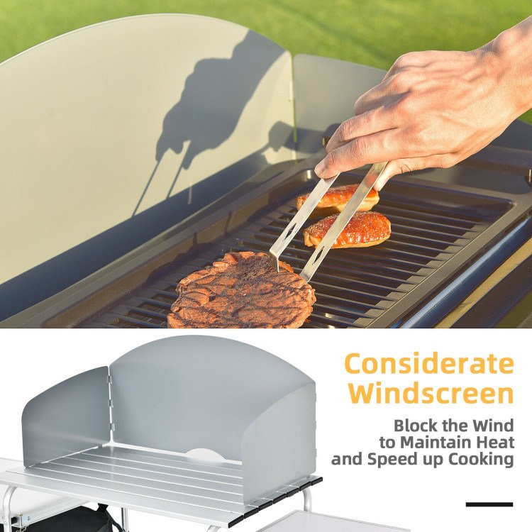 1.Cooking On the Go: Comes with large cooking table with windscreen, this portable kitchen cook station is the outdoor camping essential to ensure more effective burning and enable you to enjoy a big meal anytime. Perfect for picnics, backyard barbecues, tailgating parties, or an overnight hit outdoors.
