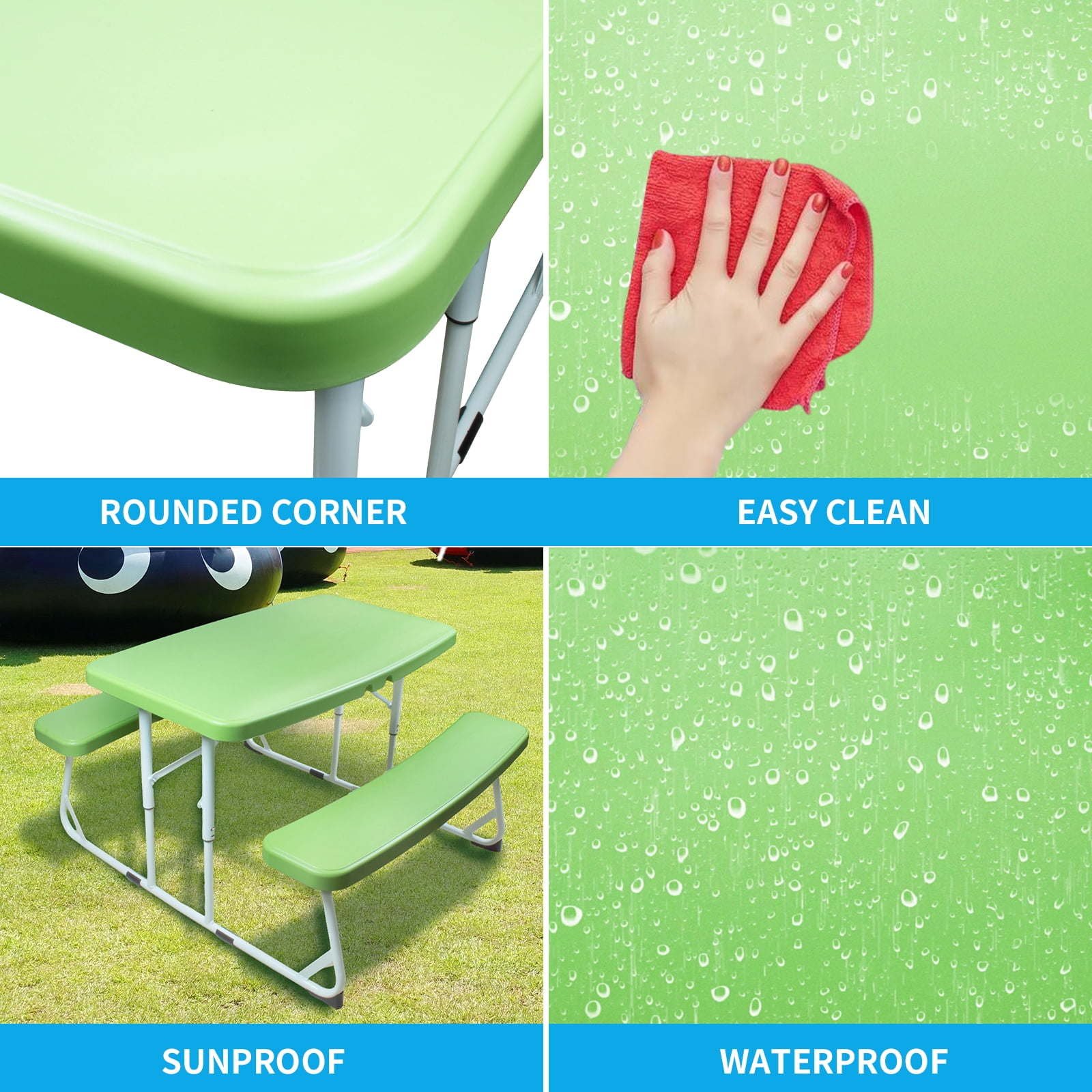 QUALITY MATERIALS37.4" Picnic Table is made of high quality HDPE (High Density Polyethylene) material, dustproof, waterproof, sunproof, suitable for outdoor use.CONVENIENT TO CARRY:The foldable frame is designed for easy storage and transportation, making it the perfect companion for outdoor activities and family outings.STABLE STEEL CONSTRUCTION:Our folding picnic table is made of sturdy steel frame, which is powder-coated to prevent rust and corrosion, and at the same time, it is extremely strong and stable; the anti-rocking and anti-tipping function of the folding table legs make this picnic table safe to use at all times.PROFESSIONAL AND PRACTICAL:Picnic tables are not only great for outdoor dining, they are also ideal for crafts and playtime, fostering creativity as well as promoting healthy physical activity.