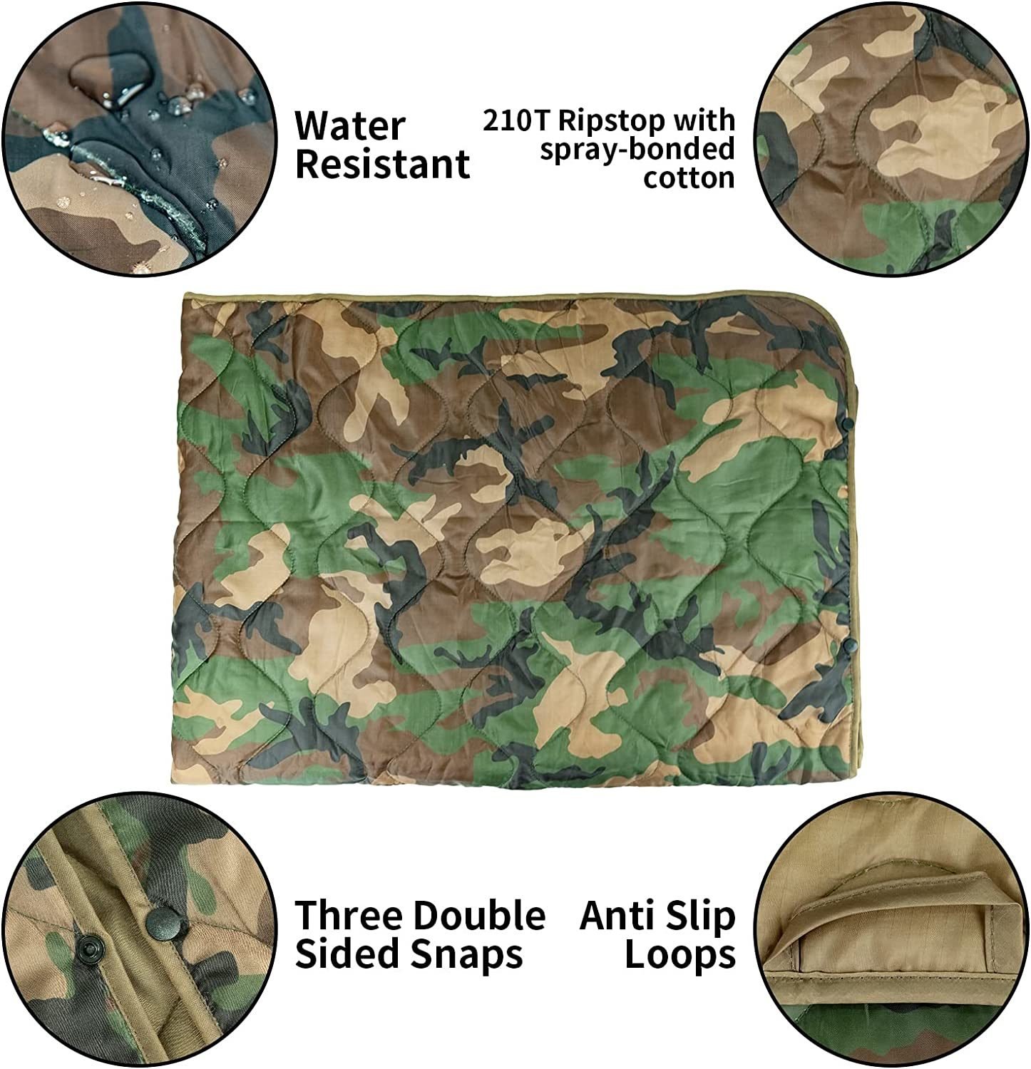 Material:210T Ripstop and filled with spray-bonded cotton WATERPROOF AND WARM BLANKET: The Woobie camo blanket is made of 210T Ripstop and filled with spray-bonded cotton; prevent water from immersion to poncho liner blanket and keep you warm and cozy; widely used in various harsh environments. One-sided with Camo Pattern; another-sided with Deep Khaki. MEASUREMENTS: This Military Emergency Poncho Liner opens up to approximately 140cm by 200cm; weighs 0.75kg and comes with matching compression sack; the bottom diameter of the compression sack is 18cm and the height is 30cm. The Blanket is packable and be fully compressed into its compression sack for easy carry and storage; reduces space and volume. MULTI-USE PONCHO LINER: Just Click the Three Premium Double Snaps can easily turn your blanket into a poncho; and keeps you hands free for chatting around the campfire; tailgating; or cozying up with your favorite book. Snaps straight into a poncho opposed to tying is a more secure attachment for sure. MULTIPURPOSE: The survival woobie blanket can be used as camping and outdoor blanket; beach mat; picnic mat; poncho; but alse a fun option at home for enjoying outdoor movie nights or fire-pits. This lightweight and compact camo blanket is great to make your camping; hiking; backpacking; picnicking; hunting; and fishing trips so much easier. PRACTICALITY: There is no more practical a piece of gear than the woobie/poncho liner! Warm but it breathes; lightweight and easy to pack; store; and wash. The waterproof army blankets can hand or machine wash; which make it are easier to maintenance.