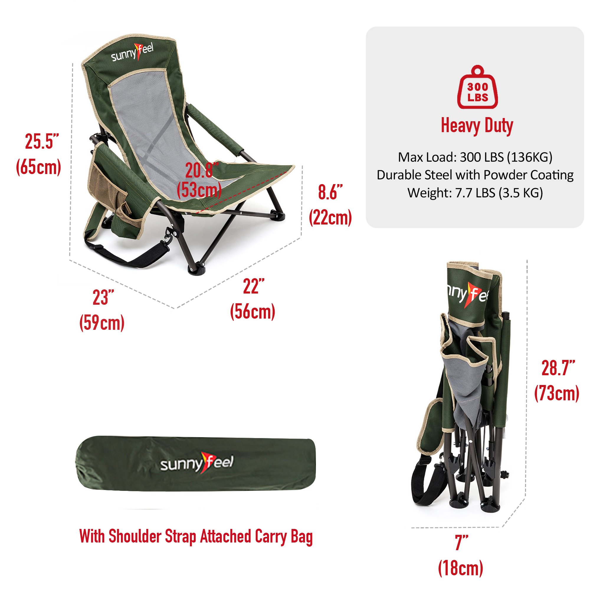 Extremely Comfy & Space Saving: The low seat beach chair seat & anti-sink leg cap & armrest design provide you an ultimate soft seating experience.The breathable and cooling mesh back design makes sitting for long comfortable for you. The small folding size (29×7.5×7 inches) saves your room while not on duty.