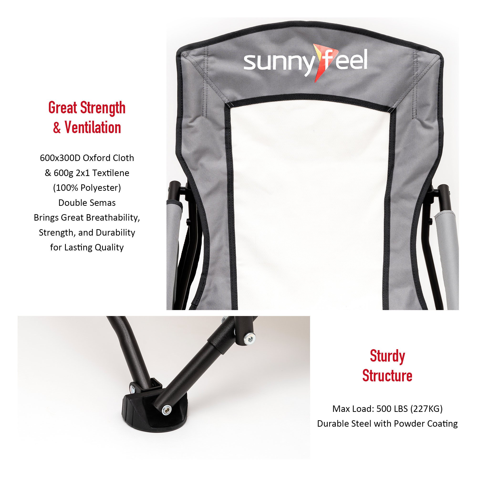 Built to Last: The sturdy steel frame construction affords up to 300 LBS (136KG) weight capacity and the chair weights only 7.5 LBS (3.4KG). The double-seam 600x300D oxford cloth & 600g 2x1 textilene has great strength, durability, and breathability. You don't have to worry for the heavy-duty use, either to buy a new folding chair in the near future.