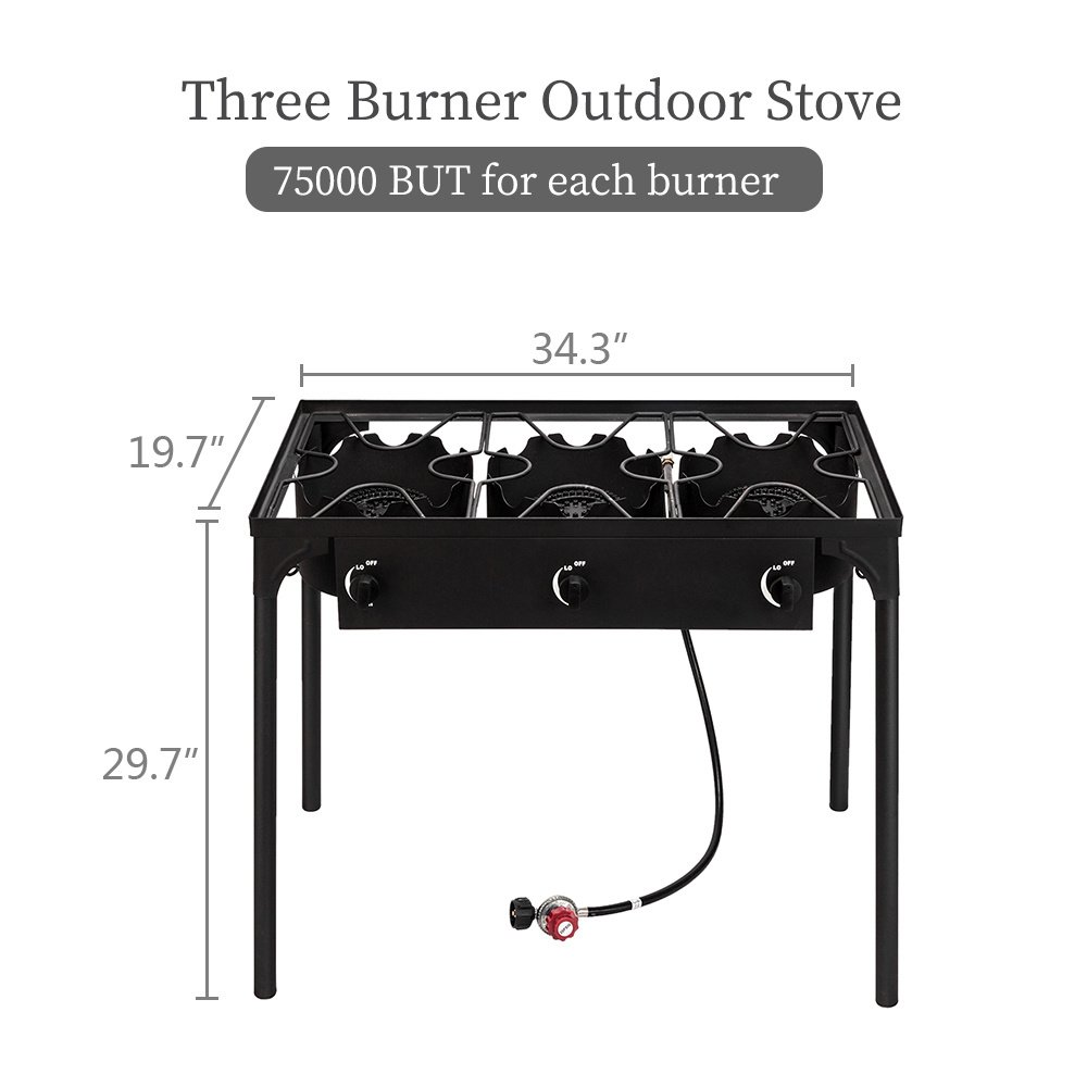 Introductions:This powerful three burner, equipped with a cast iron head, outputs a whopping BTU of 225000. And it can adjust the firepower to make your cook more delicious. It is suitable for various types of pot because of burner bracket. So you can enjoy cooking outdoor with your family to have a happy time. Do not hesitate, just buy it.Features:1. High-pressure three burner camp stove, sturdy and durable design, made of cast iron long lasting and good for projects2. 225000 BTU of cooking power3. Ultra-portable with removable legs4. CSA listed regulator certified by CSA5. 0-20 psi adjustable make cook faster and cleaner than other standard propane burners6. Perfect for camping, fishing, parties, tailgates hunting and home brewingSpecifications:1. Product Type: Three Burner2. Material: Cast Iron3. Burner Diamter: 10.24" / 26cm4. BTU: 2250005. Brand: ZOKOP6. Furnace Head Diameter: 5.51" / 14cm7. 1.2m Leather Tube Included: Yes8. Dimensions: (34.25 x 17.72 x 29.72)" / (87 x 45 x 75.5)cm (L x W x H)Package Includes:1 x Three Burner Stove1 x 0-20 Psi Regulator1 x Instruction