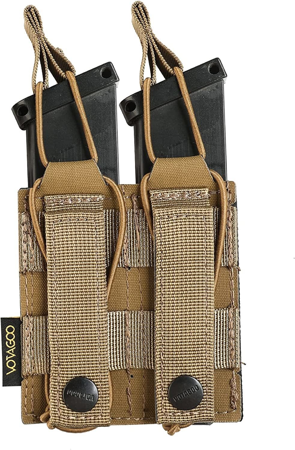 Quickly Switch: Open top design with bottom drain holes at the bottomSecured in Place : Adjustable elastic band secures different size magazines.With Molle Design: Compatible with all molle modules; tactical vests; backpacks; belts; etc.Pistol Mag Pouch: It holds 1/2/3 magazines and is suitable for most small caliber pistol magazines 1911 DD21Made of tough 500D Nylon; Single Size: 1.9x4.3x1.2inch(4.8x11x3cm); Double Size: 3.8x4.3x1.2inch(9.6x11x3cm) ; Triple Size: 5.7x4.3x1.2inch(14.5x11x3cm)