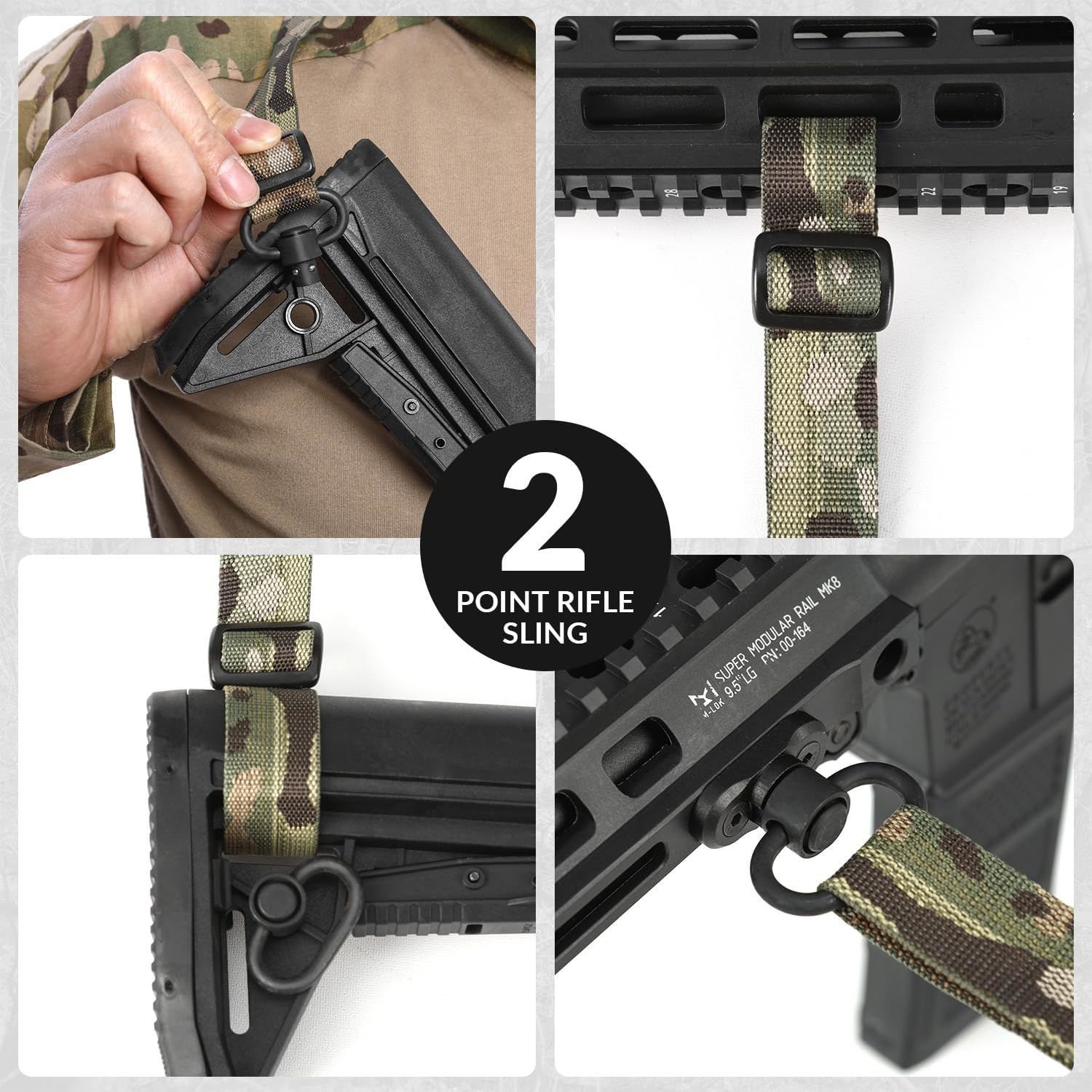 Lightning-Fast Adjustment: This two-point sling allows for rapid length adjustment through ''ONE BUCKLE'' simply pull up to release and pull down on the tab to tighten. Adapt swiftly to any combat scenario with lightning-fast adjustments, ensuring optimal weapon control. Effortlessly transition between shooting positions and achieve the perfect fit and comfort and stability. The sling swivels can be rotated 360 degrees. Press the button of the sling swivels for easy installation and removal.