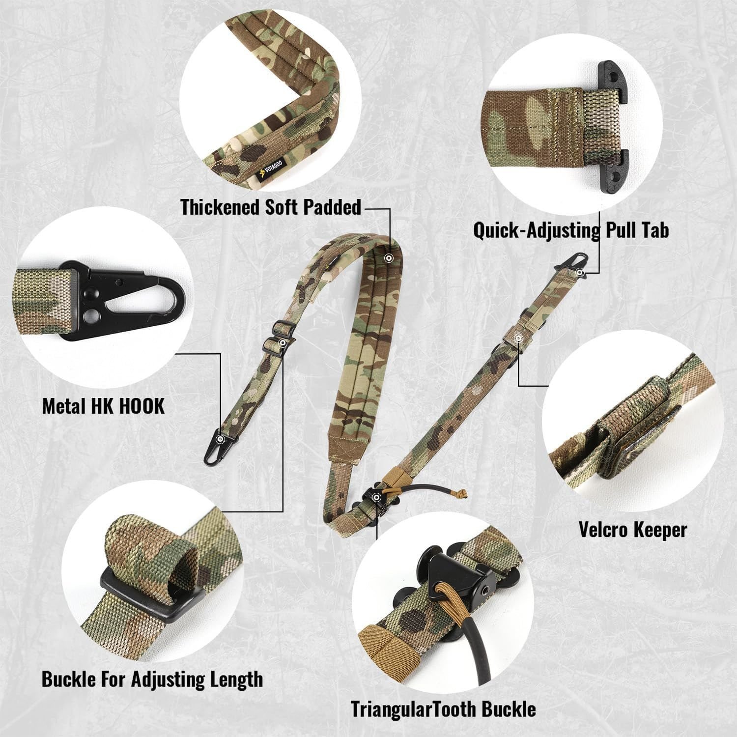 EVA Padded Tactical Sling: Gun sling 2.1'' wide inner pad shoulder strap made from one piece of EVA material that is non-absorbent and tear- resistant. It can make the wearer feel more comfortable when a long time to carry or the load is very heavy it relieves pressure on the body, which is very suitable for long-term outdoor activities. Rifle sling you can adjust the length at will. You can adjust it according to your needs, it is suitable for all people.