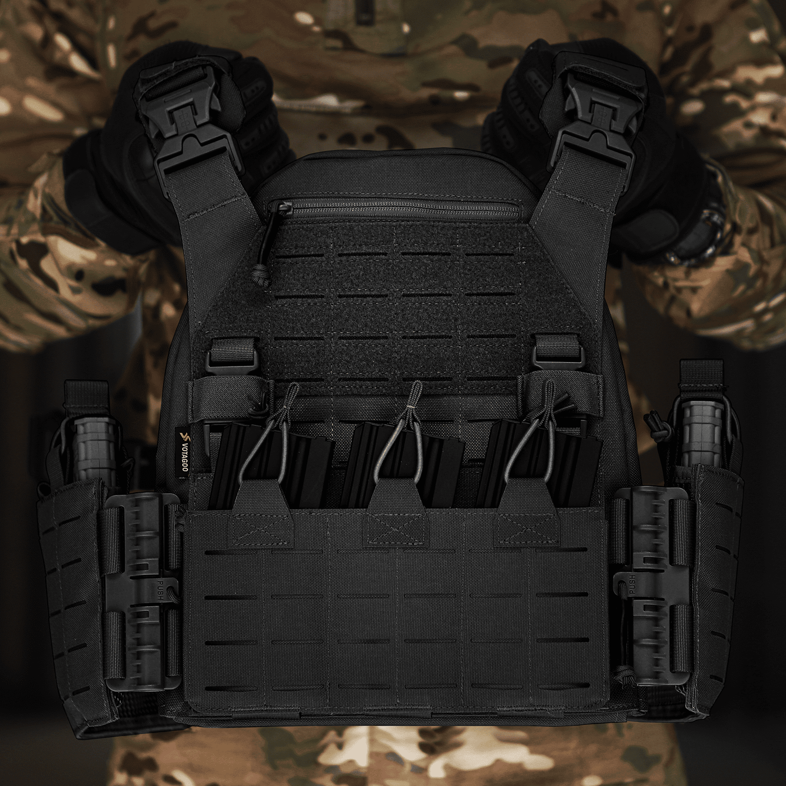 High-Strength & Wear-Resistant Material: The VOTAGOO tactical vest is made of 1000D nylon, an heavy duty fabric that resists wear, stress, and tearing. Designed to perform in diverse combat environments, our water-repellent fabric ensures minimal water absorption, making it suitable for all weather conditions.