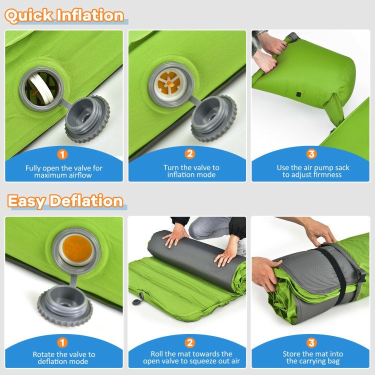1.Quick Inflation and Deflation: This sleeping pad is designed with a double-sided valve which makes inflation and deflation a breeze. You just need to fully open the valve for maximum airflow, then turn the valve to the inflation mode and use the air pump sack to adjust firmness. As for deflation, flip the valve to deflation mode, roll the mat towards the open valve to squeeze out air, and then store it in the bag.